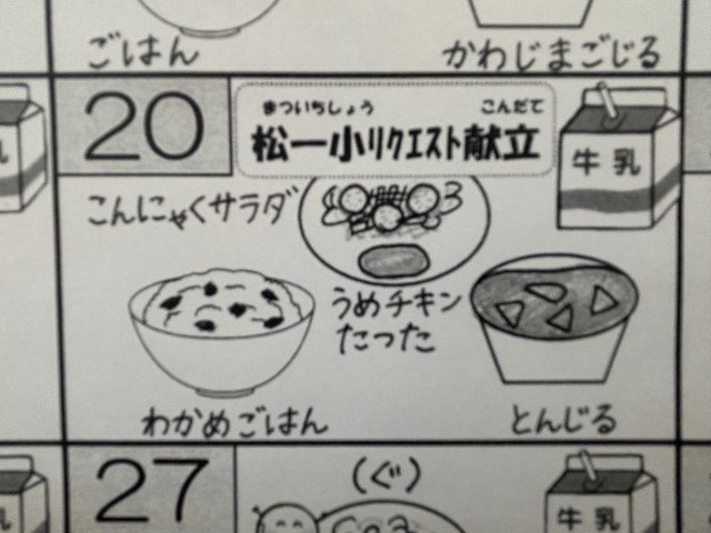 ※「こんにゃくサラダ」を予定していましたが、機械の故障のため提供ができなくなったとセンターより連絡がありました。