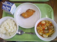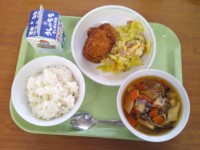 今日の給食のメニューは、ご飯、牛乳、とうふのちゅうかに、あげぎょうざです。