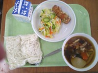 今日の給食のメニューは、わかめうどん(地粉うどん)、牛乳、ちくわのいそべあげ、だ...