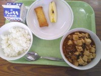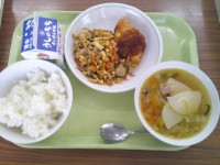 今日の給食のメニューは、ご飯、牛乳、いも...
