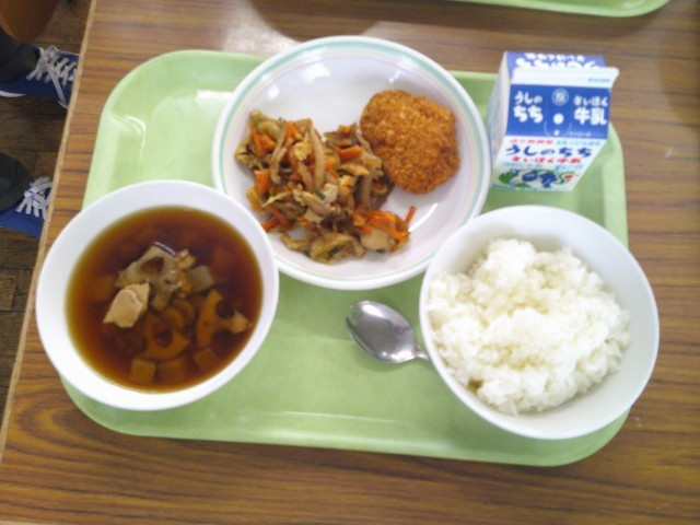 今日は食育の日で、今日の給食のメニューは、福岡県の郷土料理です。かしわめし、たちうおフライ、にぐい、牛乳です。