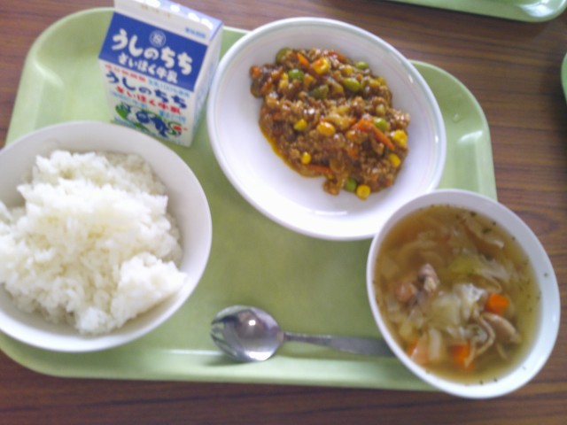 今日の給食のメニューは、なつやさいのドライカレー(ごはん)、牛乳、やさいスープです。