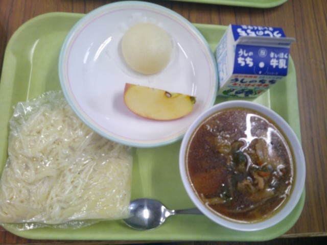 今日の給食のメニューは、スタミナラーメン(ホットちゅうかめん) 、牛乳、にくまん、りんごです。