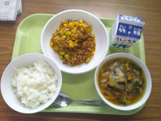 今日の給食のメニューは、キーマカレー(ごはん)、牛乳、ごもくスープです。
