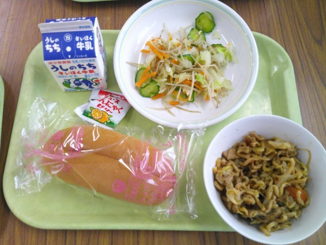 11月6日の給食 公開日 2025/11/06 更新日 2025/11/06 給食 今日の給食のメニューも「図書館リストランテ」メニューです。「くまくまパン」のやきそばパン(コッペパン、あげそば)、牛乳、ごぼうのサラダ、みかんゼリーです。