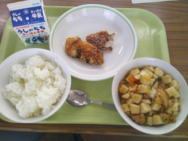 今日の給食のメニューは、ごはん、牛乳、さばのカレーあげ、とうふのちゅうかにです。