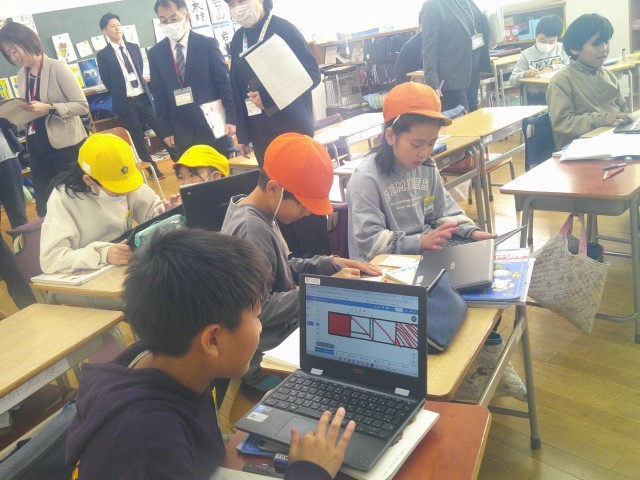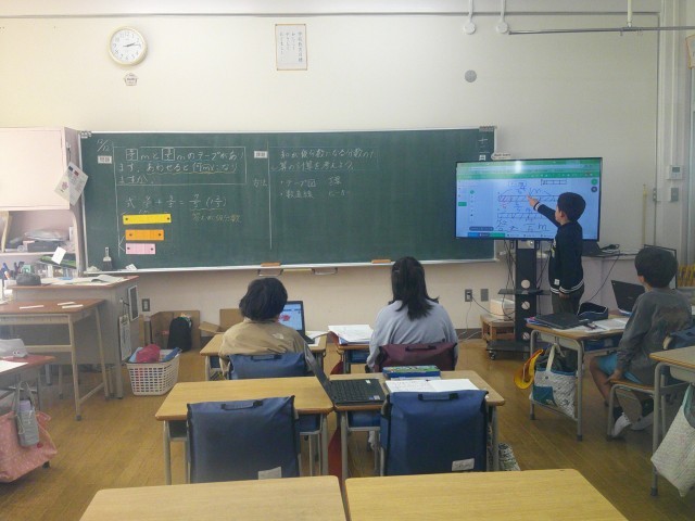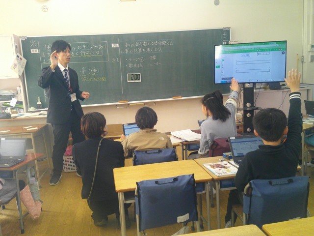 学校課題研究で、4年生が、12月12日(金)に授業研究会を行いました。教材は算数科「分数のたし算」です。子供たちは、自分の言葉で課題を設定し、既習事項を活用して、自分の言葉で解き方を説明したり、自分の言葉でまとめをしたりと一生懸命学習に取り組みました。