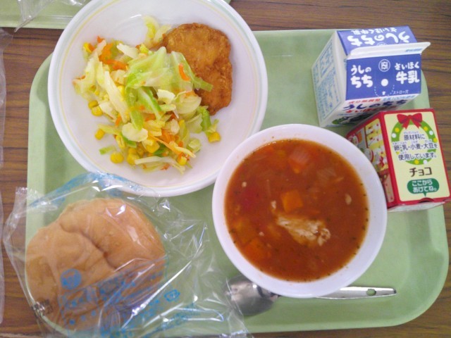 今学期最後の給食 公開日 2025/12/22 更新日 2025/12/22 給食 今日は、クリスマス献立が給食に出ました。今日の給食のメニューは、クリスピーチキンサンド(セサミバーンズ、クリスピーチキン)、牛乳、コールスロー、ミネストローネ、サンタさんのケーキです。2学期もおいしい給食をありがとうございました。