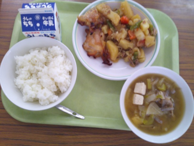 今日は松山第二小学校のリクエスト献立が給食に出ました。今日の給食のメニューは、ご飯、牛乳、てりやきチキン、にくじゃが、とんじるです。