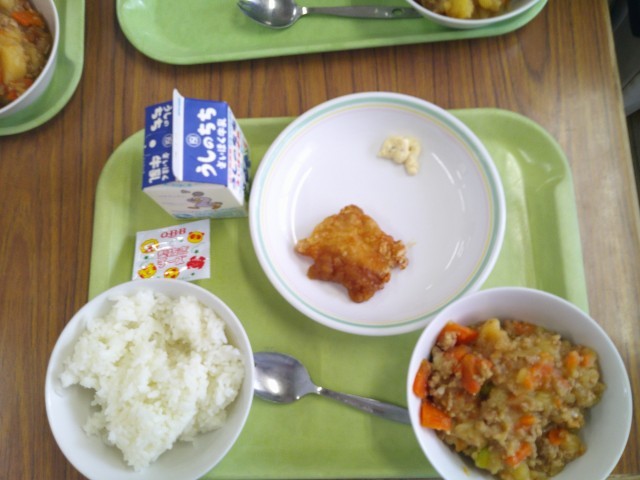 今日の給食のメニューは、ご飯、牛乳、じゃがいものそぼろに、チキンなんばん、かたぬきチーズです。