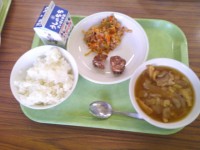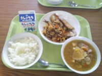 今日の給食のメニューは、カレーなんばん(じごなうどん) 、牛乳、だいがくいも、だ...