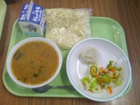 今日の給食のメニューは、スタミナラーメン(ホットちゅうかめん) 、牛乳、にくまん...