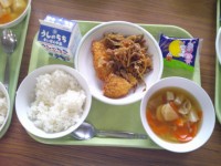 今日の給食のメニューは、ご飯、牛乳、とりにくのからあげ、やさいいため、わかめのみ...