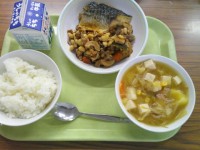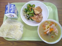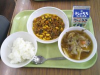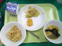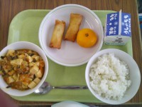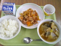 今日の給食のメニューは、ご飯、牛乳、...