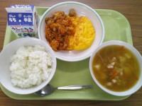 今日の給食のメニューは、ご飯、牛乳、タコライスのぐ、チーズオムレツ、もちむぎいり...