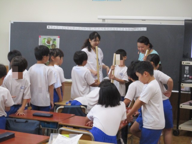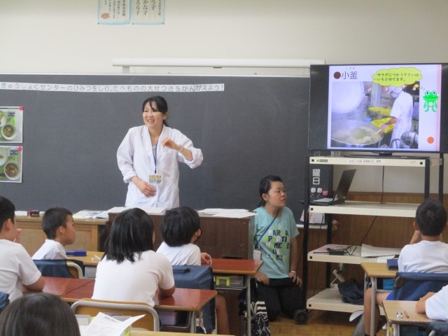 2年生が食育の授業を行いました。給食センターの栄養士さんから食べ物の大切さや給食センターの様子について教えていただきました。映像や写真を使ったわかりやすい説明の後、実際に調理に使われる器具に触れる体験もしました。子どもたちは楽しみながら「食」への理解を深め、毎日の給食がどれほど多くの人の手で支えられているかを学ぶことができました。