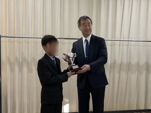 12月22日に、東松山市理科教育研究発表会において、『梶田隆章博士ノーベル賞受賞記念賞』を受賞した本校6年生が、梶田先生から直接トロフィーを授与されました。