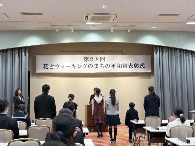 花とウォーキングのまちの平和賞の表彰式が行われ、高坂小学校からは3名の児童が出席しました。
