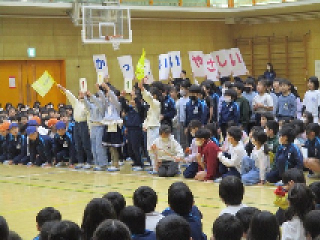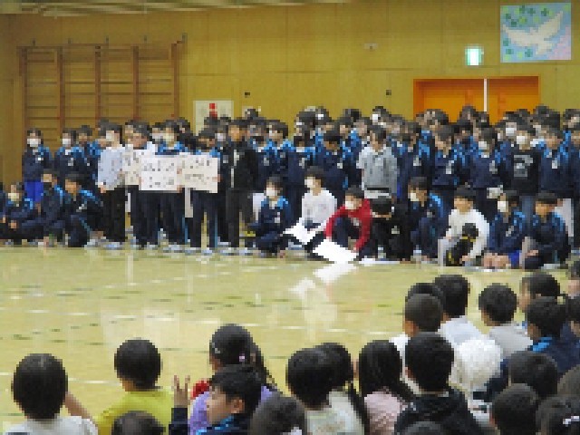 体育館に全校児童が集まり、卒業を間近に控えた6年生への感謝を伝える「6年生ありがとうの会」が行われました。会場は、終始温かい拍手と笑顔に包まれ、とても素敵な雰囲気に満ちた会になりました。