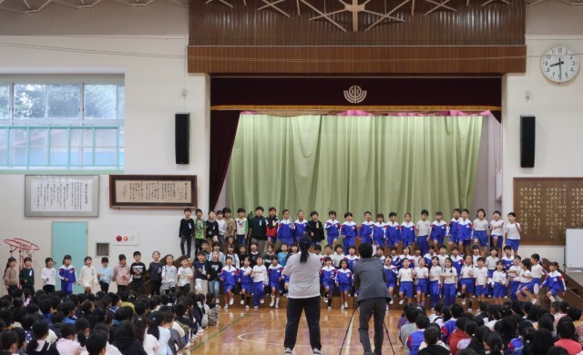 音楽朝会(1年生)の発表[全校 10月22日(水)] 公開日 2025/10/22 更新日 2025/10/22 学校生活のようす 1年生たちが、「さんぽ」を発表してくれました。曲の途中でミツバチやトカゲ、ヘビ、バッタ、きつね、たぬきなど歌詞の中に出てくる生き物のカードを見せたり、足を上げて散歩をする姿を表現するなど、元気のよい演奏を披露してくれました。