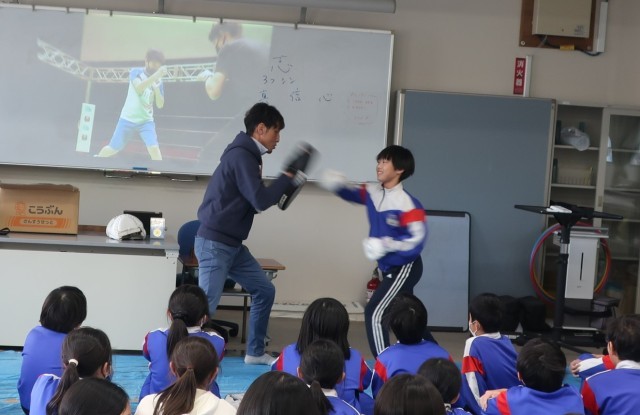 6年生総合「未来の自分を考える」の第二弾として元プロボクサーの方をお迎えしました。普段は、市の川小にも教材を届けてくれる業者さんで、児童たちにも顔なじみの方です。「思いは招く」「今日という日を一所懸命生きる」「100点は取りにくいが、100%は誰でも出せる」「Heartを強く」など児童たちはあたたかなメッセージをたくさんいただきました。代表児童にミット打ちも体験させていただきました。