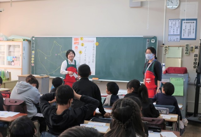 5年生の国語科(年賀状の書きかた)について、市内の郵便局の職員の方々をゲストティーチャーとしてお迎えいたしました。年賀状とは、1年に一度、新年に送るあいさつやお便りのことで、この習慣は1000年以上前からある日本の伝統文化であることを学びました。また、年賀状の書き方、十二支や賀詞のこと、間違ったあいさつの例など紹介していただきました。最後に児童たちは本物のはがきを使い家族などへの年賀状を仕上げました。