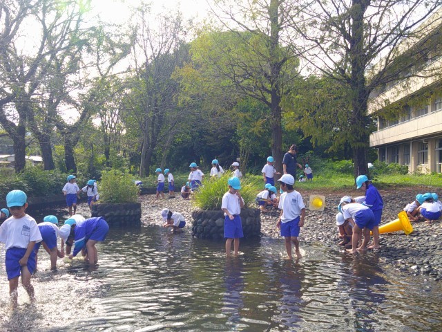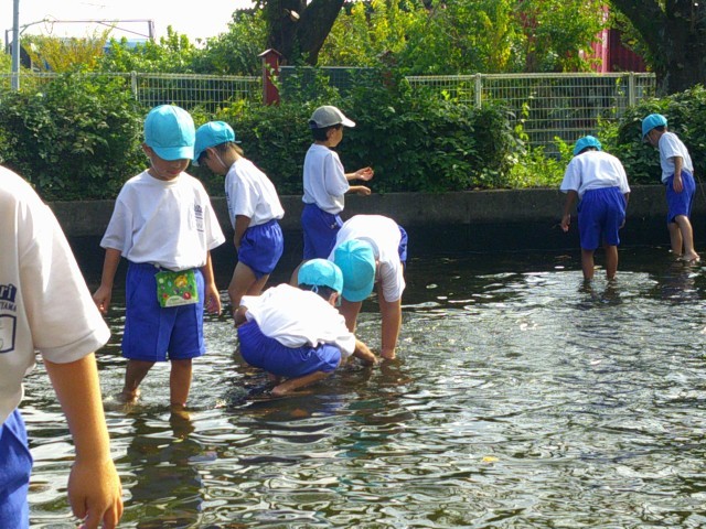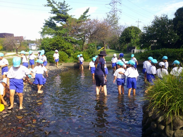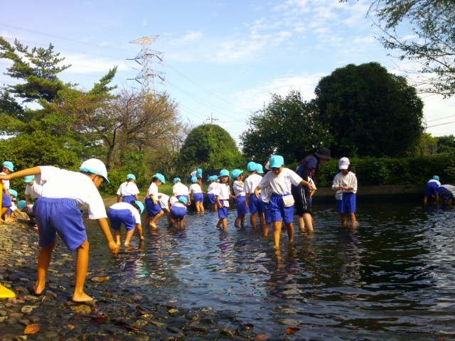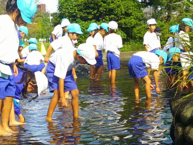 1年生は5時間目にすあし川で遊びました。最後ということもあり、みんな全力ですあし川を楽しんでいました。ヤゴやゲンゴロウ、タニシなどすあし川にいるたくさんの生き物を見つけたり、捕まえたりしていました。