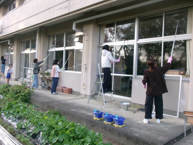 11月7日(金)にPTA教養美化担当の方が教室棟1階の窓掃除に取り組んでくださいました。窓にこびりついた砂埃をピカピカに磨いていただき、窓が見違えるほど美しくなりました。お母さんに混ざって小さなお手伝いさんも一緒に頑張っていました。お忙しい中、環境美化にご協力いただき本当にありがとうございました。