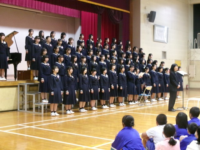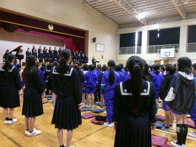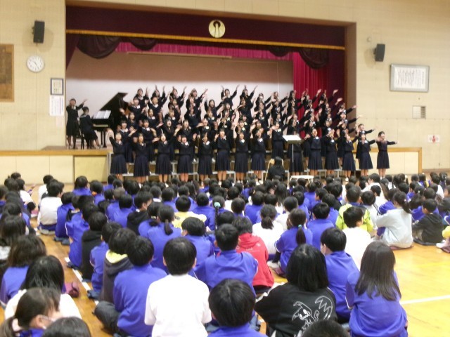 芸術鑑賞教室が行われました。今年は、同じ地域にある松山女子高等学校音楽部の生徒さんに合唱を披露していただきました。全国トップクラスの歌声を目の前で聴き、子供たちも自然と体を揺らしたり、手拍子をしたりして、歌の中に引き込まれていく感じでした。