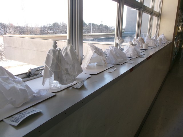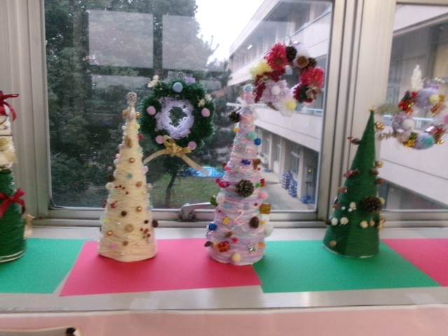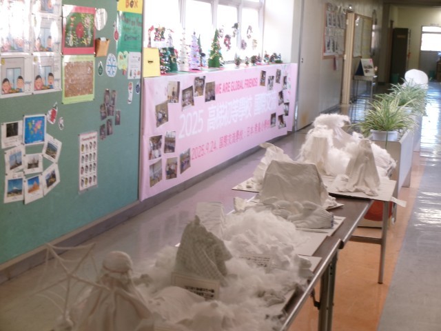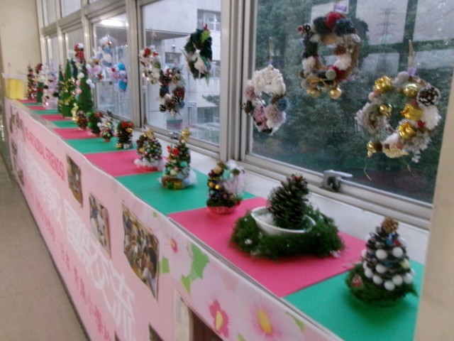今回は6年生となかよし学級の作品が廊下いっぱいに並んでいます。12月にふさわしい白を基調とした作品とクリスマスの作品です。