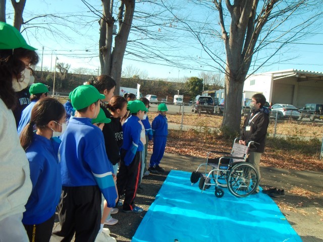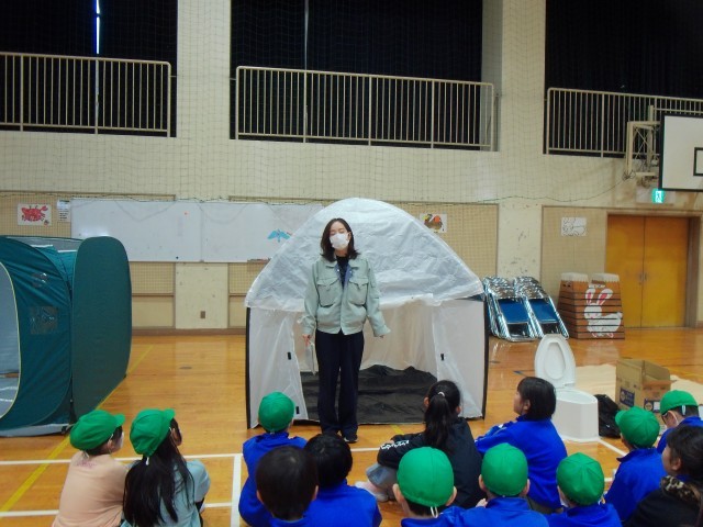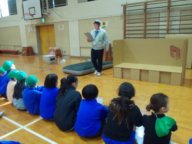4年生が防災学習を行いました。避難所で活用する段ボール別途・簡易トイレ・プライベートテントをどのように使うのか、防災倉庫の中に入っているものが何かを実際に見て学びました。