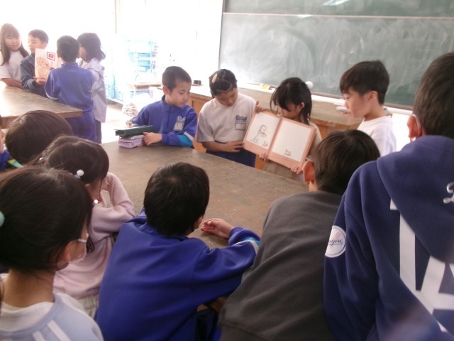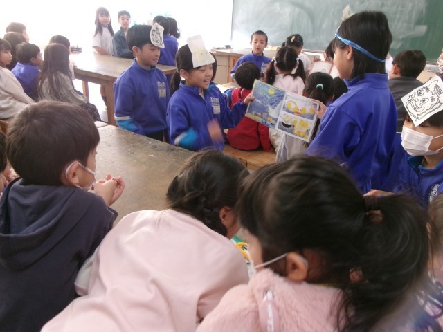 3年生では、国語「おすすめの本を紹介しよう」の学習をしました。班ごとにおすすめの本を選び、2年生に紹介することにしました。お話が伝わりやすいように読み方を練習したり、簡単なペープサートを作ったりと、工夫しながら本を読んで紹介することができました。