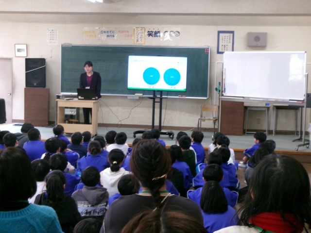 5年生の学年行事で「食育講座」を行いました。栄養教諭の佐藤さんが、子供たちの給食アンケートの結果、学校給食センターの様子、栄養についてスライドを用いながら話してくださいました。食事の大切さ、自分の食事の振り返りができるよい時間となりました。