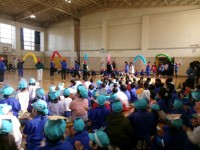 新入生を歓迎する「1年生おめでとう集会」が行われました。5年生の作るアーチの下を...