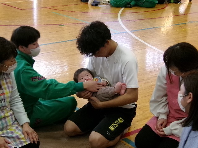 当日、たくさんの赤ちゃんが松山中学校の体育館に集結しました。ご協力ありがとうございました。3年生は、乳幼児とのふれあいをもって、穏やかな時間を過ごすことができました。